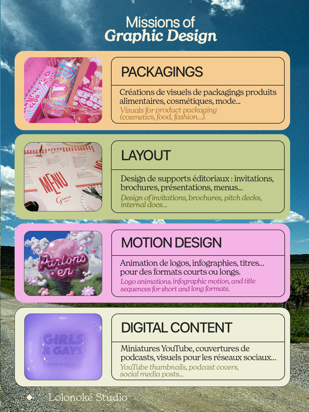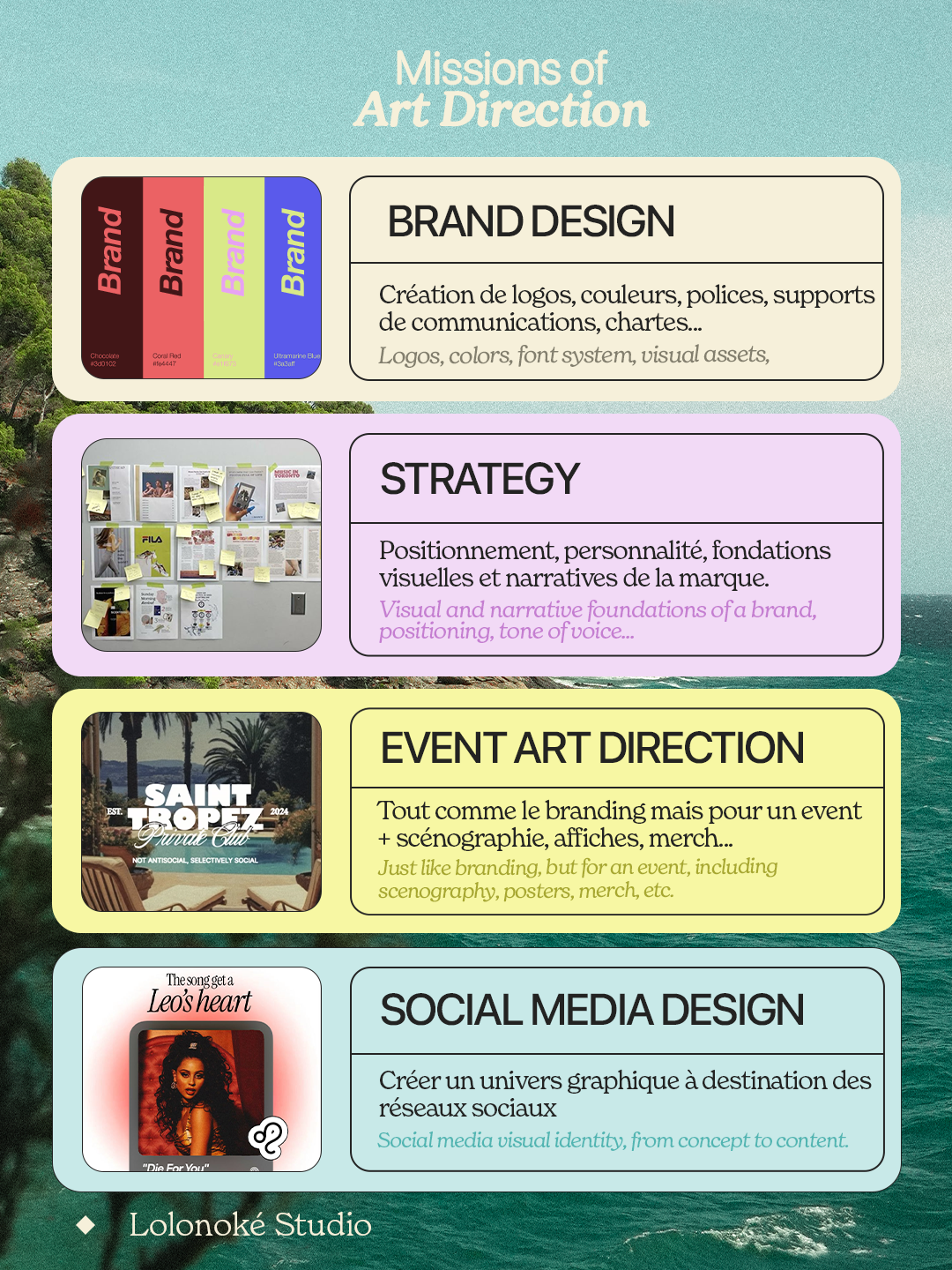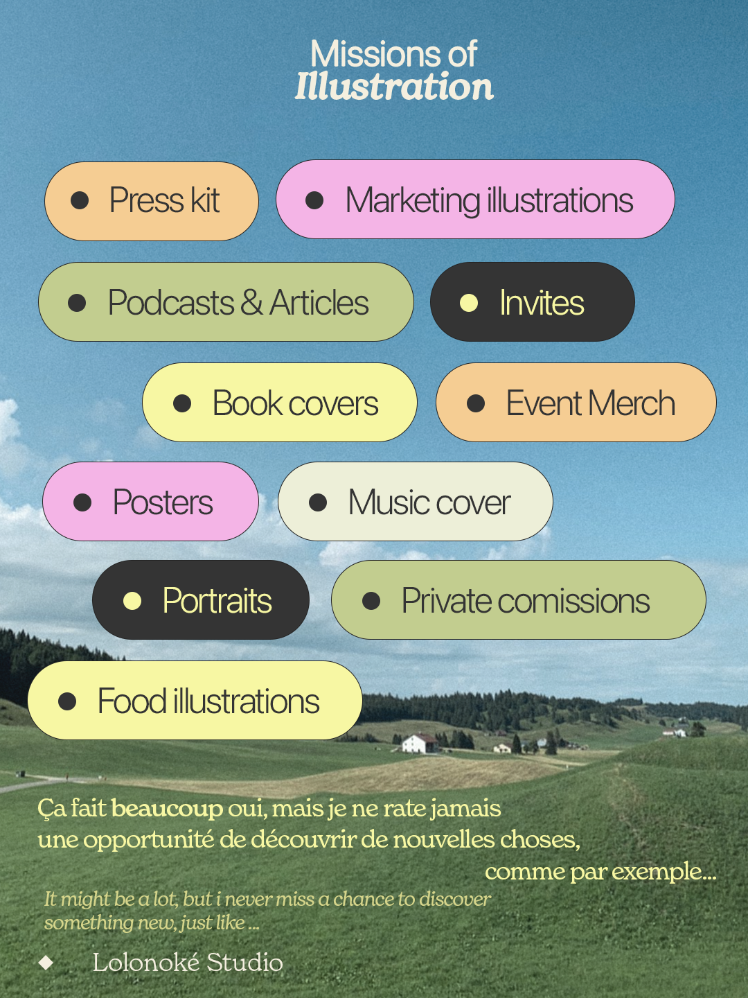 Ultra-polyvalente (branding, stratégie, illustration, graphisme, motion design), j’aime surtout explorer des projets variés et adapter mon style à l’histoire de mes clients.