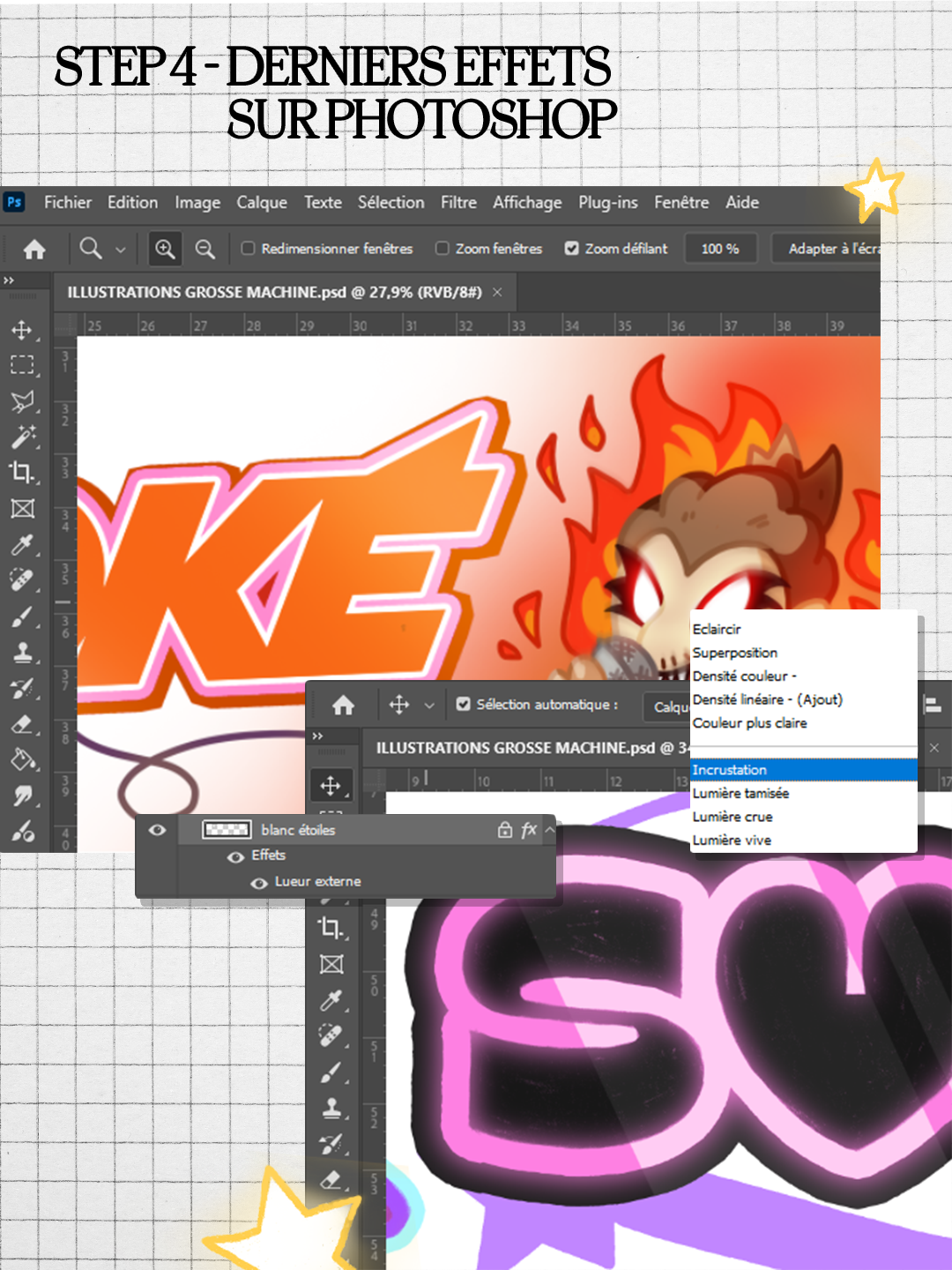 Avec Valentin, nous avons créé les designs des cases de La Grosse Machine de Mc Fly & Carlito rénovée par Amaury : Valentin à la typo, et moi à l’illustration !